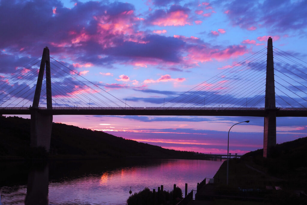 这座日落大桥的正式名称叫内滩大桥,从1992年到2001年,共花了10年的时间和功夫由石川县施工建造。总共花费88亿8,800万日元。 全长344米的斜拉桥( 用对角线构造的桥梁),宛如一只白天鹅,那优美的姿势已成为内滩町的新标志。最令人感动的是黄昏时刻。从这里远眺落在日本海的夕阳,可使人感动地忘却呼吸。值得推荐的最热观景点